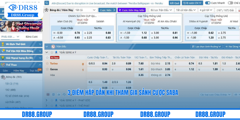 Saba Sport là lựa chọn lý tưởng cho người chơi yêu thích cá cược thể thao đa dạng và tỷ lệ minh bạch. DR88 mang đến nền tảng an toàn, dễ sử dụng và liên tục cập nhật các tính năng mới. Người tham gia có thể trải nghiệm trực tiếp các trận đấu và tối ưu chiến lược cược.